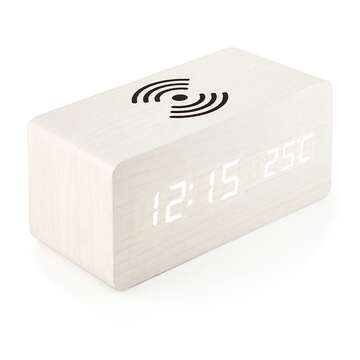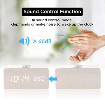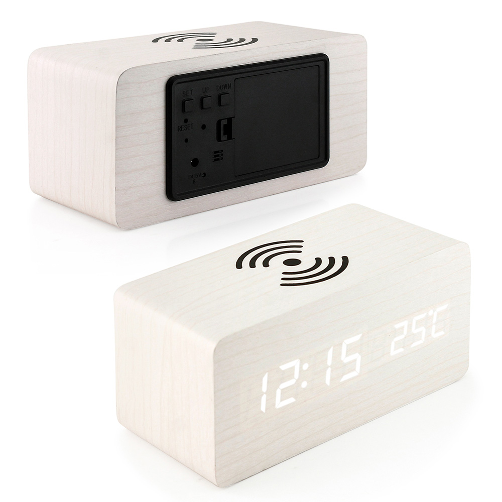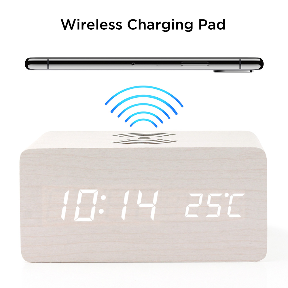 Home/Home/Oct17 Wooden Alarm Clock with Qi Wireless Charging Pad Compatible with iPhone Samsung Wood LED Digital Clock Sound Control Function, Time Date, Temperature Display for Bedroom Office Home - White