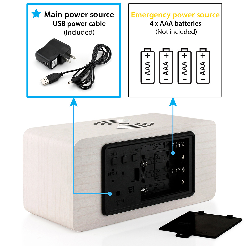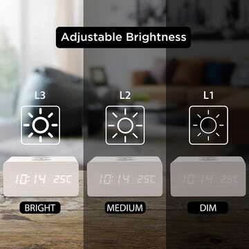 Add a touch of modern to your bedroom, living room or office with this sleek and elegant looking voice control eco-friendly alarm clock which can also be used as a Qi wireless charger that matches perfectly with any modern designed office or home furniture. Designed for simplicity, there are no buttons or plastic parts on the front and sides of the clock. It displays time, date and temperature clearly with bright and adjustable LED lights for a clean yet modern look. You can set up to 3 alarms in a few minutes intervals to replace the snooze function. And for your convenience, it can also be used as a Qi wireless charger for compatible Samsung or iPhone models, simply place your phone on the top of the clock, and it'd start charging automatically. Dual power mode: can be plugged in via USB cable (included), or backed up by 4 AAA batteries (not included).