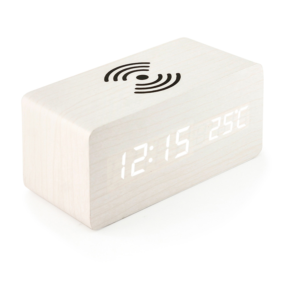 Oct17 Wooden Alarm Clock with Qi Wireless Charging Pad Compatible with iPhone Samsung Wood LED Digital Clock Sound Control Function, Time Date, Temperature Display for Bedroom Office Home - White